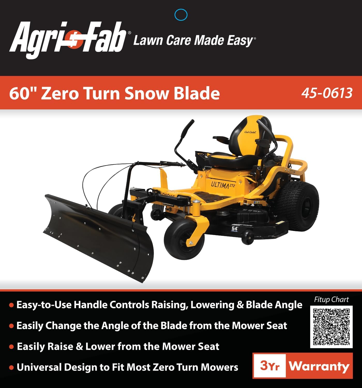 With the Agri-Fab 45-0613 snow blade clearing snow just became a whole lot easier. This 60 in. snowblade designed for Zero Turn Mowers and is for snow removal only. You will have the ability to place the snow where you want it as this snow blade can angle left, center or to the right. The blade can be lifted with the easy-to-use handle, that controls both the raising and lower of the blade along with how you want the angle adjusted. The scraper blade is adjustable and the ZT Snowblade is constructed with heavy duty 14-gauge steel. This 60 in Zero Turn Snowblade comes with Agri-Fab 3-Year Limited Warranty. The Agri-Fab 45-0613 SnowBlade is Compatible with the following Zero-Turn Mowers: Bad Boy ZT Avenger/MZ Bad Boy Magnum, Bad Boy Maverick, Big Dog Diablo MP, Bobcat ZT3000 Series, Country Clipper Challenger, Country Clipper Avenue, Craftsman Z6600, Cub CadetProz Z 972 L EFI/Pro Z 972 LKW/ZTX4 Series/ZTX5 Series/ZTX6 Series, DeWalt Z254/Z260/Z160/Z148, Dixie Chopper Eagel HP, Dixie Chopper Blackhawk HP/Blackhawk SS, Encore Edge/Edge Pro, Exmark Quest E Series, Exmark Radius S Series, Exmark Lazer ZX Series(72"/60"/54" Decks), Exmark Lazer Z S Series (72"/60"/54" Decks), Exmark Lazer Z E Series (71"/60"/54" Decks), Gravely ZT HD/Pro-Turn ZX/Pro-Turn 100 Series, Husqvarna P ZT5224, Hustler Super 104, Hustler Raptor X/Raptor XD/Raptor XDX, Hustler Diesel Z, Worldlawn Power Equipment King Cobra FX801/FX850, John Deere Z425/Z740R/Z950M/Z915E/Z930R/Z930M/Z970R/Z730M/Z545EFI/Z530M/Z720E/Z530R/Z515E/Z997, John Deere Z355R/Z365R, Kioti ZXR60SE/ZXR48/ZXC60LT/ZXC54, Kubota Z781/Z422 Models, Mean Green Mowers Nemesis, RedMax CZT60+, RedMax CZT60TX, Scag Patriot/Freedom/Liberty/EVZ, Snapper Pro S 200 Series, Toro Titans/Zmaster 5000 Series/Zmaster 6000 Series/Zmaster 7000 Series