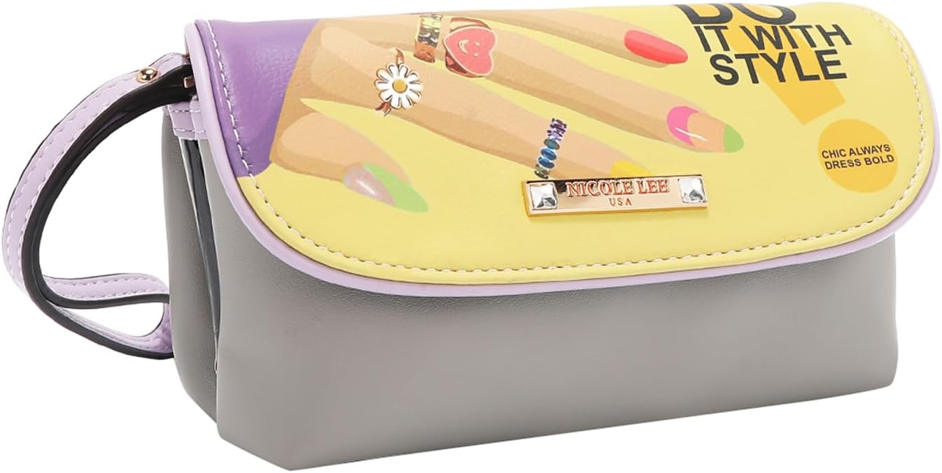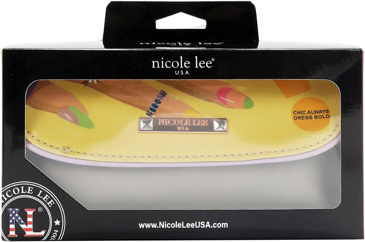 Elevate your beauty routine with this stylish NICOLE LEE makeup bag. Crafted from vegan leather, this sophisticated cosmetic case features a practical fold-over flap with a magnetic snap button closure for secure storage. The thoughtfully designed interior showcases two clear zip compartments, making it effortless to locate and organize your cosmetics while simplifying cleaning. A convenient zipper puller with wristlet strap adds functionality to its chic design. Measuring 7.5 inches in length, 3 inches in width, and 3.5 inches in height, this lightweight bag weighs just 0.5 pounds, perfect for daily use or travel. The exclusive print interior lining in polyester adds a distinctive touch to this fashionable yet practical makeup storage solution. Keep your beauty essentials organized and easily accessible with this versatile NICOLE LEE makeup bag.