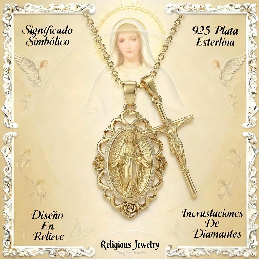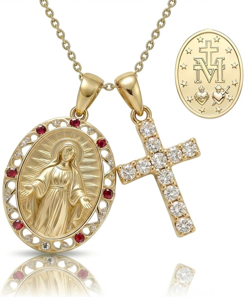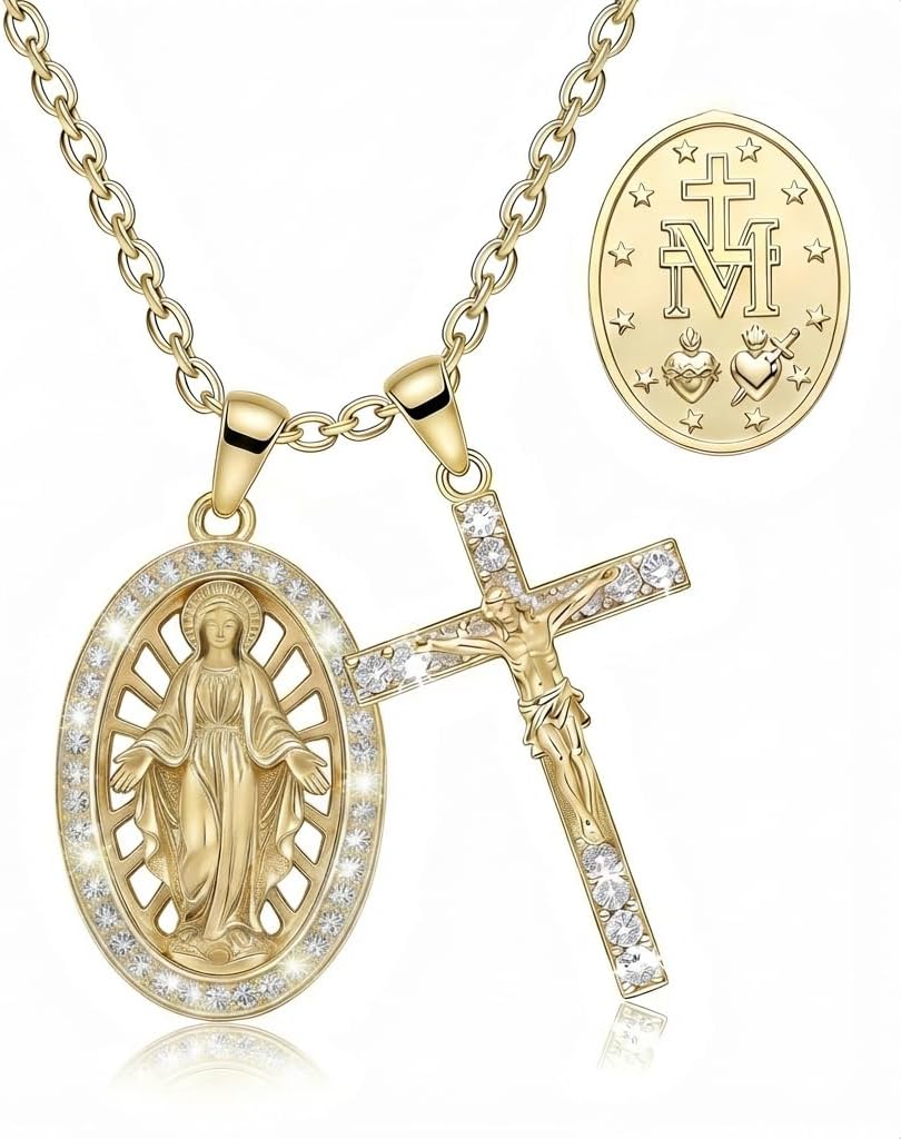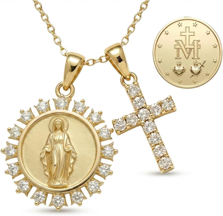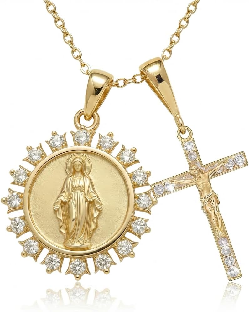 Embrace Divine Grace with Our Layered Medal & Cross Necklace SetDiscover profound faith and elegant style with our Gold Catholic Layered Religious Pendant Set. This exquisite collection, meticulously crafted from S925 sterling silver and lavishly Gold plated, features a cherished Medal pendant women hold dear, paired harmoniously with a Sparkling cross pendant. It's more than just jewelry; it's a testament to belief, a Marian devotion necklace that brings solace and inspiration to your everyday life. Each Blessed Virgin Mary pendant is intricately designed, showcasing the beloved imagery of the Catholic Virgin Mary pendant and Our Lady of Grace pendant, beautifully accented with sparkling Cubic Zirconia. The delicate Rose accent Virgin Mary necklace detail adds a unique touch of beauty and reverence.Symbolism & Meaning: A Story of FaithThe Medal, prominently featured in our Gold Mary pendant CZ, represents a powerful symbol of grace, protection, and intercession from the Blessed Mother. Worn by countless faithful, it serves as a constant reminder of Mary's love and perpetual help. Paired with the timeless cross, a universal emblem of sacrifice, redemption, and eternal hope, this Two pendant religious necklace creates a holistic expression of your spiritual journey. When you wear this Virgin Mary and Cross Necklace Set, you carry with you centuries of devotion and a connection to the sacred, making it a powerful Devotional Virgin Mary pendant and a truly meaningful Meditation necklace. The CZ framed Virgin Mary necklace adds a subtle sparkle, reflecting the light of your faith.Uncompromising Quality & Comfort for Catholic WomenWe understand the importance of both beauty and durability. Our Gold plated Virgin Mary necklace is crafted using a high-quality S925 sterling silver base, ensuring it is Hypoallergenic and safe for even the most sensitive skin. The advanced